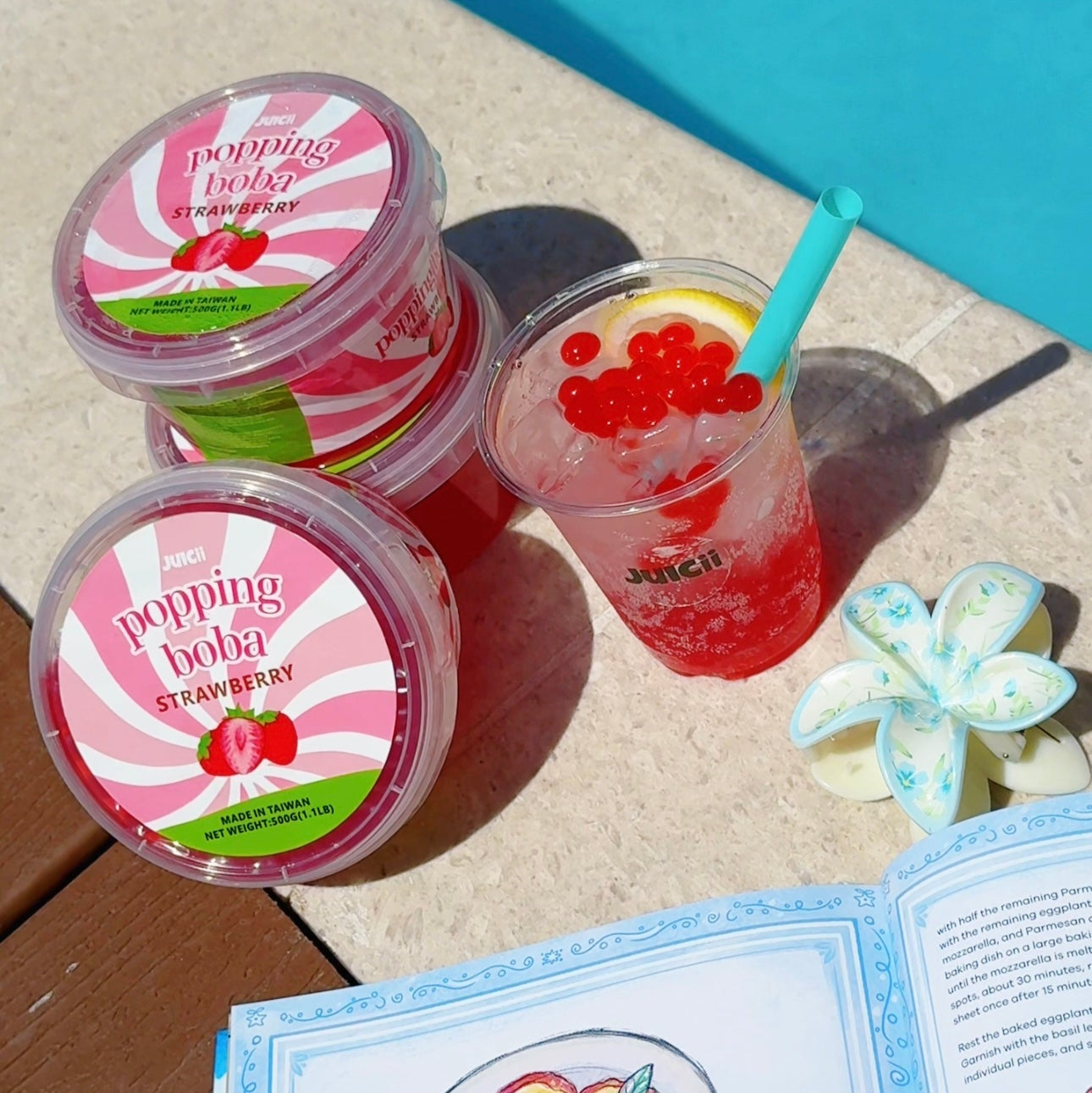 Add 2 tablespoons of strawberry popping boba to your favorite drink or dessert.